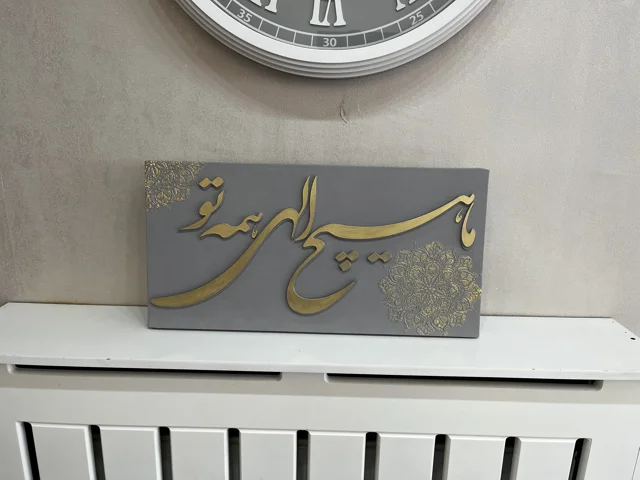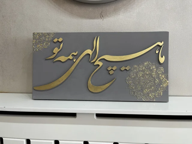 تابلوي كاليگرافي با متن ماهيج الهي همه تو كه درسايز ٣٠*٦٠ روي بوم اجراشده حروف كار چوب هستن كه با ورق طلاي مايع كار شده رنگ زمينه و متن قابل تغيير به سيلقه شماست